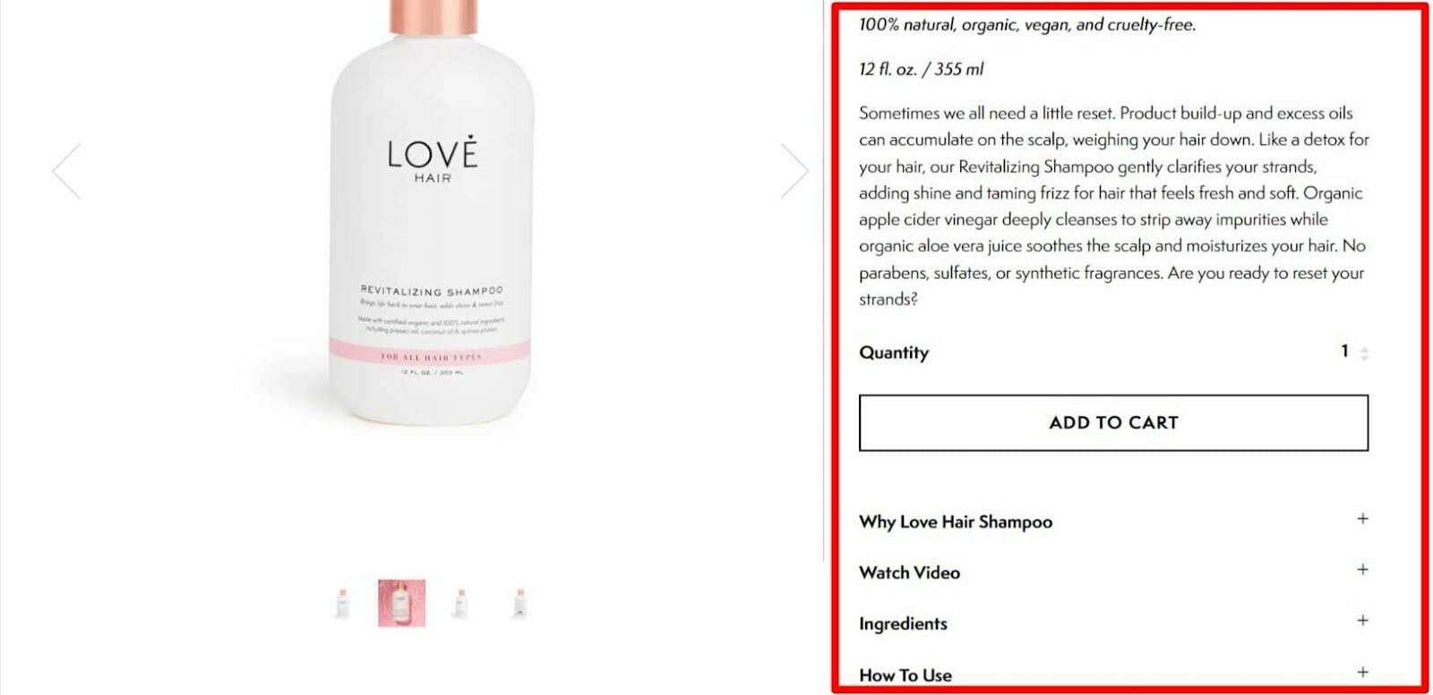 Take Love Hair, for example. On each product page, the company covers key details about the product, addresses the pain points of target customers, and describes the benefits they get from it.
