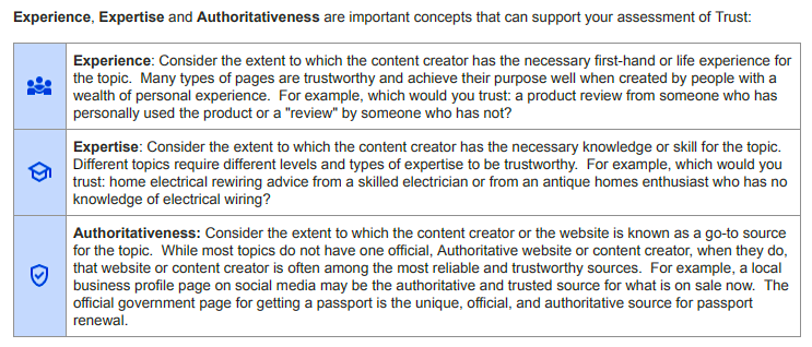 In December of 2022, Google Search made a major update to its content quality radar, focusing on the E-E-A-T principle. This acronym stands for “Experience, Expertise, Authority and Trust”: