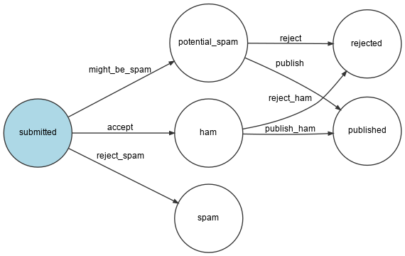 submitted-Zustand, wenn ein Kommentar von einemr Benutzerin abgegeben wird; - Lasse den Kommentar vom Spam-Checker analysieren und setze den Zustand entweder auf