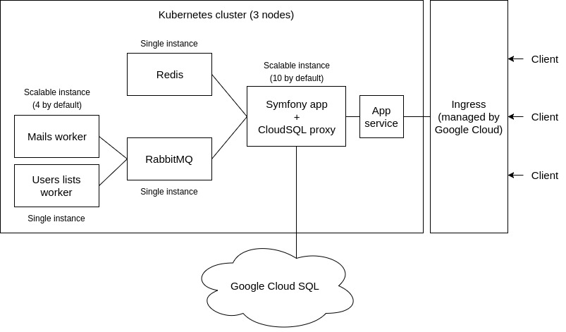 Scalability was the top priority of the project, especially after the issues they faced with the first version of the platform that wasn't built with Symfony. The following diagram shows an overview of the project architecture, which is extremely scalable and redundant where needed: