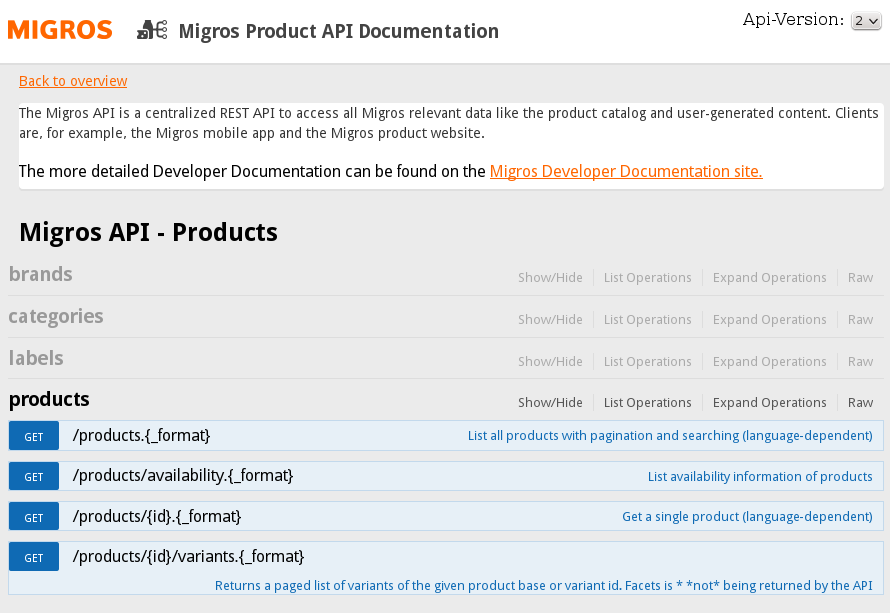 Together with the client, Liip chose an agile process. The minimum viable product was simply to provide the product data in JSON and XML format. After some months, the point of having enough functionality available was attained and the M-API went live. In the last 18 months, we constantly added new data sources and additional API end points, releasing in two-week sprints.